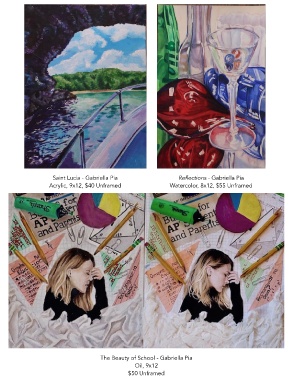 Saint Lucia - Gabriella Pia Reflections - Gabriella Pia Acrylic, 9x12, $40 Unframed Watercolor, 8x12, $55 Unframed The Beauty of School - Gabriella Pia Oil, 9x12 $50 Unframed