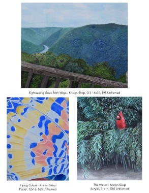 Sightseeing Goes Both Ways - Kristyn Skop, Oil, 16x20, $95 Unframed Flying Colors - Kristyn Skop The Visitor - Kristyn Skop Pastel, 12x16, $65 Unframed Acrylic, 11x14, $85 Unframed