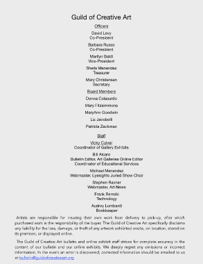 The Guild of Creative Art bulletin and online exhibit staff strives for complete accuracy in the