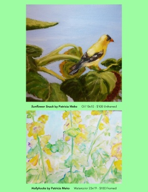 Sunflower Snack by Patricia Meko Oil 10x10 - $100 Unframed Hollyhocks by Patricia Meko Watercolor 23x19 - $100 Framed