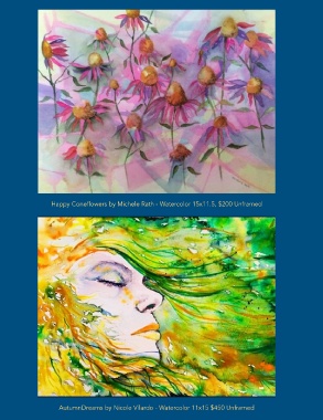 Happy Coneflowers by Michele Rath - Watercolor 15x11.5, $200 Unframed AutumnDreams by Nicole Vilardo - Watercolor 11x15 $450 Unframed