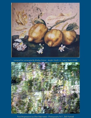 Lemons For Lemonade By Marilyn Fahrer - Acrylic 16x20 (in Frame 18x22) $350 Pond Impressions by Ellen Rubinstein - Photography 9x11, $60 Framed