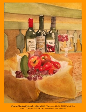 Wine and Garden Delights by Michele Rath - Watercolor 20x16 - $300 Matted Only Artist’s Comment: Still Life from my garden and wine bottles