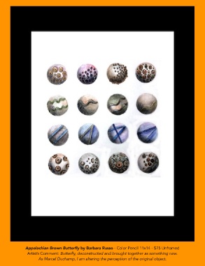 Appalachian Brown Butterfly by Barbara Russo - Color Pencil 11x14 - $75 Unframed Artist’s Comment: Butterfly, deconstructed and brought together as something new. As Marcel Duchamp, I am altering the perception of the original object.