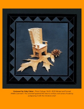 Curiouser! by Vicky Culver - Photo Collage 10x10 - $125 Matted and Framed Artist’s Comment: The cone/leaf spawned the idea to confuse one’s sense of scale by juxtaposing it with the miniature chair!