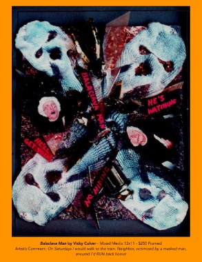 Balaclava Man by Vicky Culver - Mixed Media 12x11 - $250 Framed Artist’s Comment: On Saturdays I would walk to the train. Neighbor, victimized by a masked man, ensured I’d RUN back home!