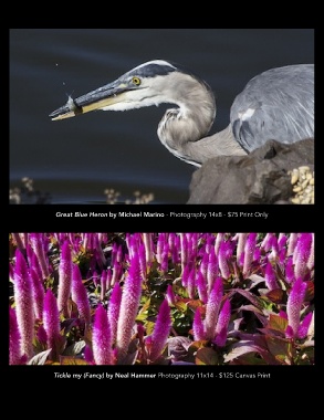 Great Blue Heron by Michael Marino - Photography 14x8 - $75 Print Only Tickle my (Fancy) by Neal Hammer Photography 11x14 - $125 Canvas Print
