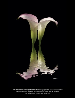 Twin Reflections by Stephen Ravner - Photography 13x19 - $120 Print Only Artist’s Comment: A pair of lovely calla lilies in an unusual location, casting an eerie reflection in the water