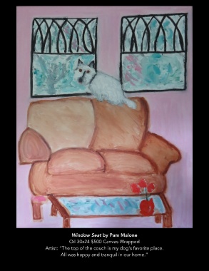 Window Seat by Pam Malone Oil 30x24 $500 Canvas Wrapped Artist: “The top of the couch is my dog's favorite place. All was happy and tranquil in our home.”