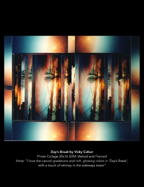 Day’s Break by Vicky Culver Photo Collage 20x16 $350 Matted and Framed Artist: “I love the natural gradations and rich, glowing colors in ‘Day’s Break’, with a touch of whimsy in the sideways trees!”