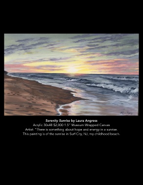 Serenity Sunrise by Laura Angress Acrylic 30x48 $2,000 1.5” Museum Wrapped Canvas Artist: “There is something about hope and energy in a sunrise. This painting is of the sunrise in Surf City, NJ, my childhood beach.