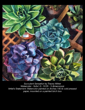 Succulent Sensation by Tracey Witter Watercolor - 9x9x1.5 - $135 - 3 dimensional Artist’s Statement: Watercolor painted on Arches 140 lb cold pressed paper, mounted on a painted birch box