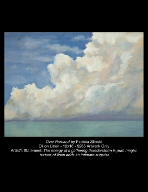 Over Portland by Patricia Zilinski Oil on Linen - 12x16 - $265 Artwork Only Artist’s Statement: The energy of a gathering thunderstorm is pure magic; texture of linen adds an intimate surprise