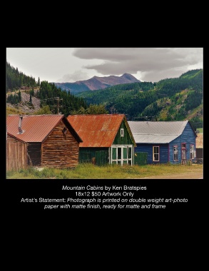 Mountain Cabins by Ken Bratspies 18x12 $50 Artwork Only Artist’s Statement: Photograph is printed on double weight art-photo paper with matte finish, ready for matte and frame