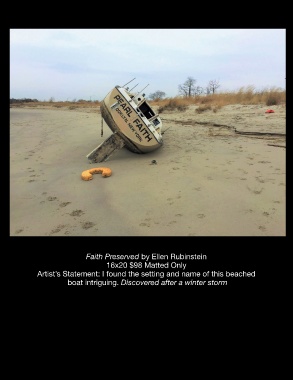 Faith Preserved by Ellen Rubinstein 16x20 $98 Matted Only Artist’s Statement: I found the setting and name of this beached boat intriguing. Discovered after a winter storm