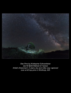 Star Pine by Kristopher Schoenleber 22x18 $200 Matted & Framed Artist’s Statement: A starry sky and milky way captured over a hill top pine in Winthrop, WA