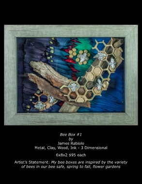 Bee Box #1 by James Rabiolo Metal, Clay, Wood, Ink - 3 Dimensional 6x8x2 $95 each Artist’s Statement: My bee boxes are inspired by the variety of bees in our bee safe, spring to fall, flower gardens