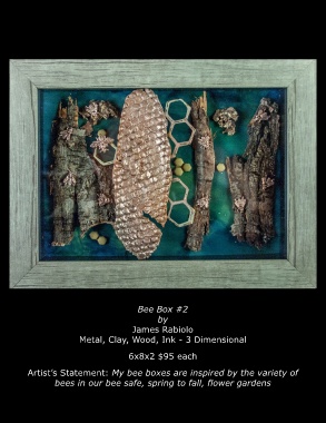 Bee Box #2 by James Rabiolo Metal, Clay, Wood, Ink - 3 Dimensional 6x8x2 $95 each Artist’s Statement: My bee boxes are inspired by the variety of bees in our bee safe, spring to fall, flower gardens