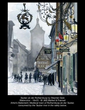 Tauber ob der Rothernburg by Stephen Gale Watercolor - 19x23 - $1,900 Matted & Framed Artist’s Statement: Medieval town of Rothernburg ob der Tauber, consumed by the Tauber river in the valley below.