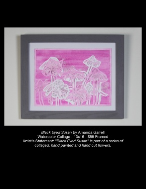 Black Eyed Susan by Amanda Garrell Watercolor Collage - 13x16 - $55 Framed Artist’s Statement: “Black Eyed Susan” is part of a series of collaged, hand painted and hand cut flowers.