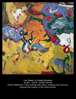 Live Stream by Sheila Grabarsky Acrylic - 24x24 - $1500 Framed Artist’s Statement: I love working with colors, creating color harmony. Enjoyed the mystery of the colors evolve.