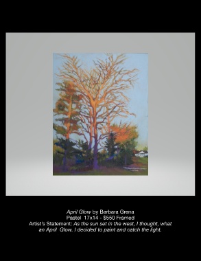 April Glow by Barbara Grena Pastel 17x14 - $550 Framed Artist’s Statement: As the sun set in the west, I thought, what an April Glow. I decided to paint and catch the light.