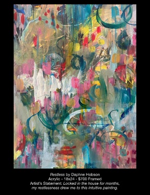 Restless by Daphne Hobson Acrylic - 18x24 - $700 Framed Artist’s Statement: Locked in the house for months, my restlessness drew me to this intuitive painting.