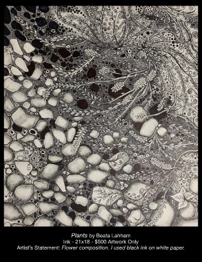 Plants by Beata Lahham Ink - 21x18 - $500 Artwork Only Artist’s Statement: Flower composition. I used black ink on white paper.
