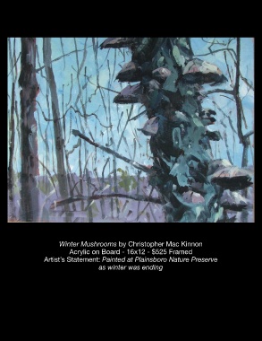 Winter Mushrooms by Christopher Mac Kinnon Acrylic on Board - 16x12 - $525 Framed Artist’s Statement: Painted at Plainsboro Nature Preserve as winter was ending