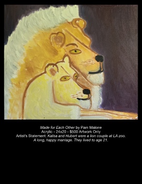 Made for Each Other by Pam Malone Acrylic - 24x20 - $500 Artwork Only Artist’s Statement: Kalisa and Hubert were a lion couple at LA zoo. A long, happy marriage. They lived to age 21.