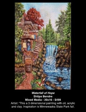Waterfall of Hope Shilpa Bendre Mixed Media - 20x16 - $499 Artist: “This a 3 dimensional painting with oil, acrylic and clay. Inspiration is Minnewaska State Park fall.